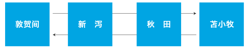 | 新泻→秋田 | 运航日/周一・周二・周三・周四・周五・周六 所要时间/6小时35分钟 |