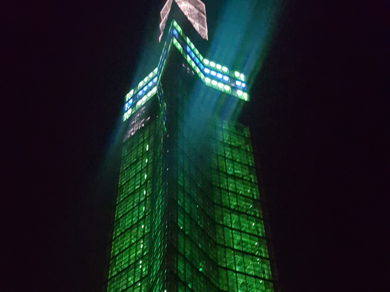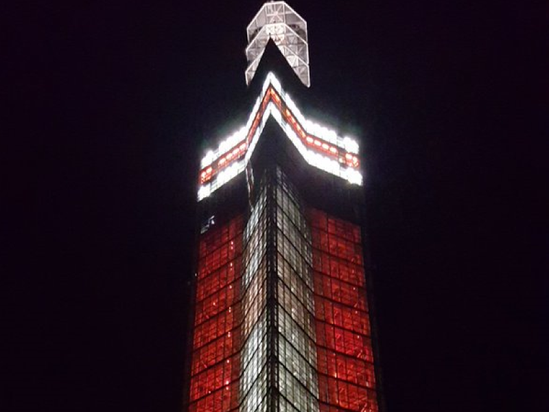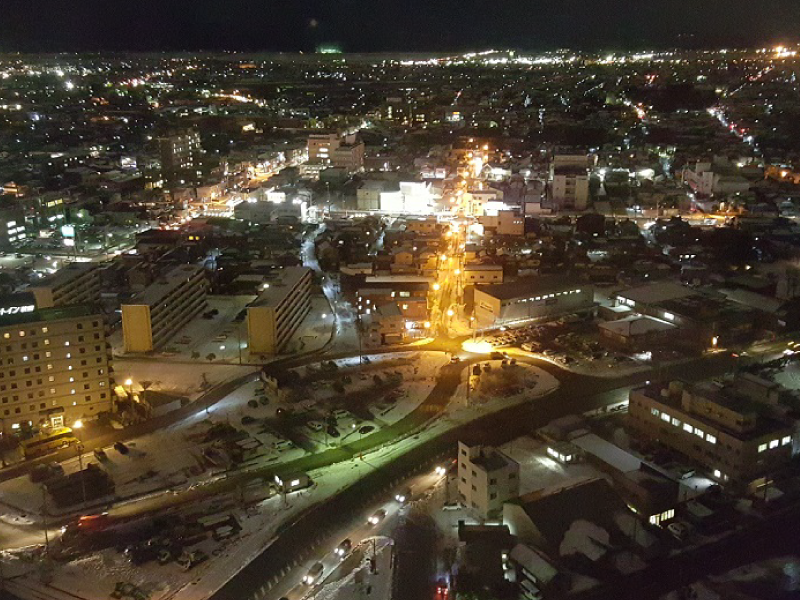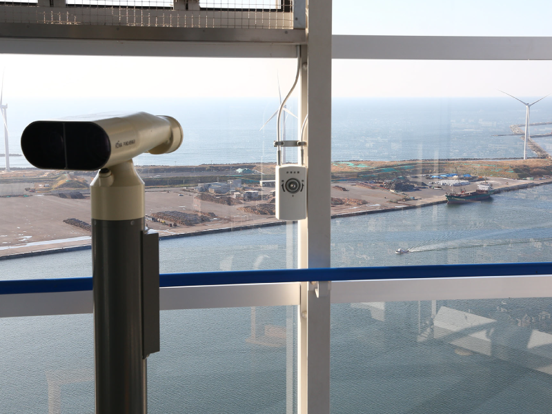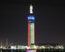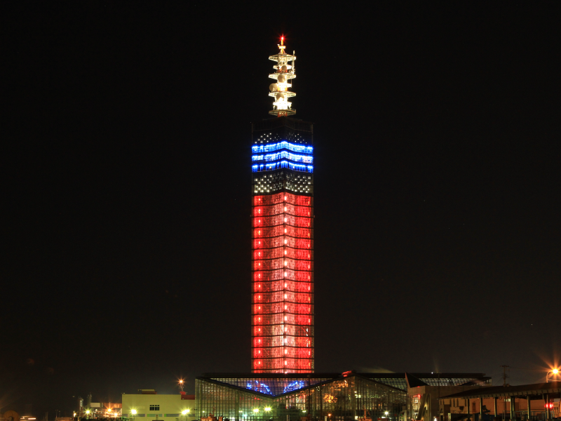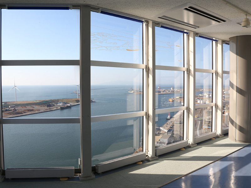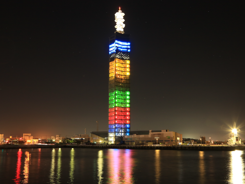 港塔•SELION全高143m。它的骨架由6272张强化玻璃构造而成。在黄昏被彩灯照耀,和秋田港的美景融为一体。