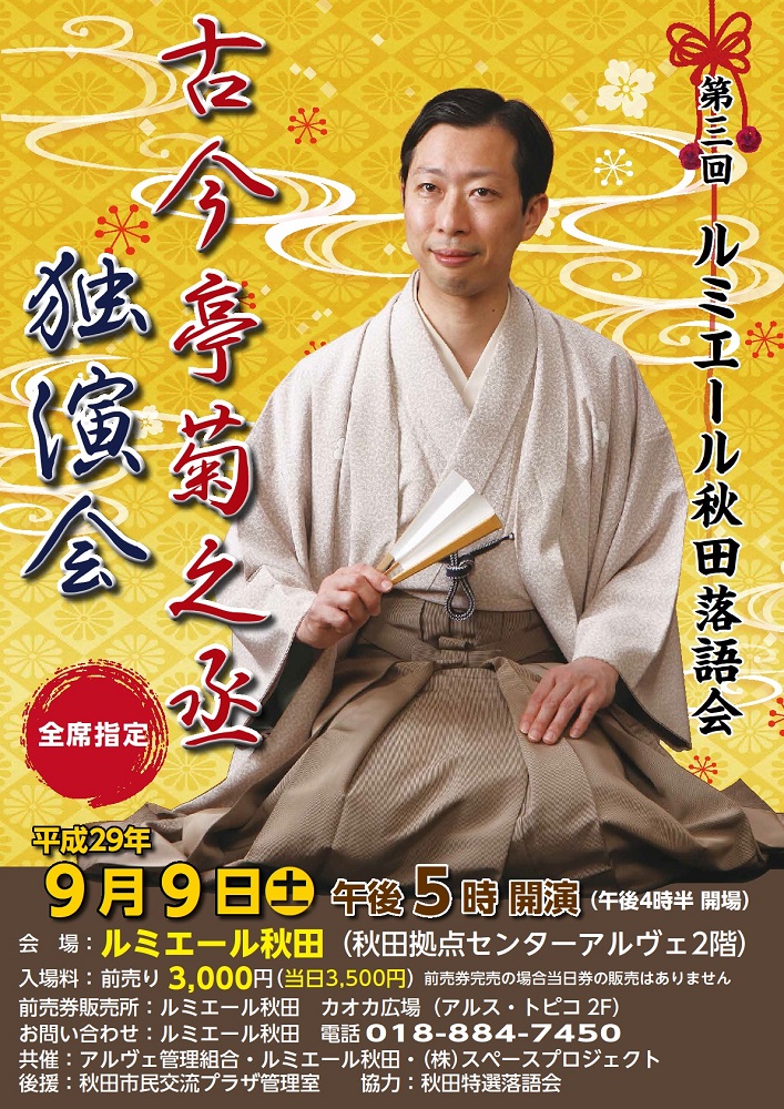 第3回となるルミエール秋田落語会は古今亭菊之丞独演会です。