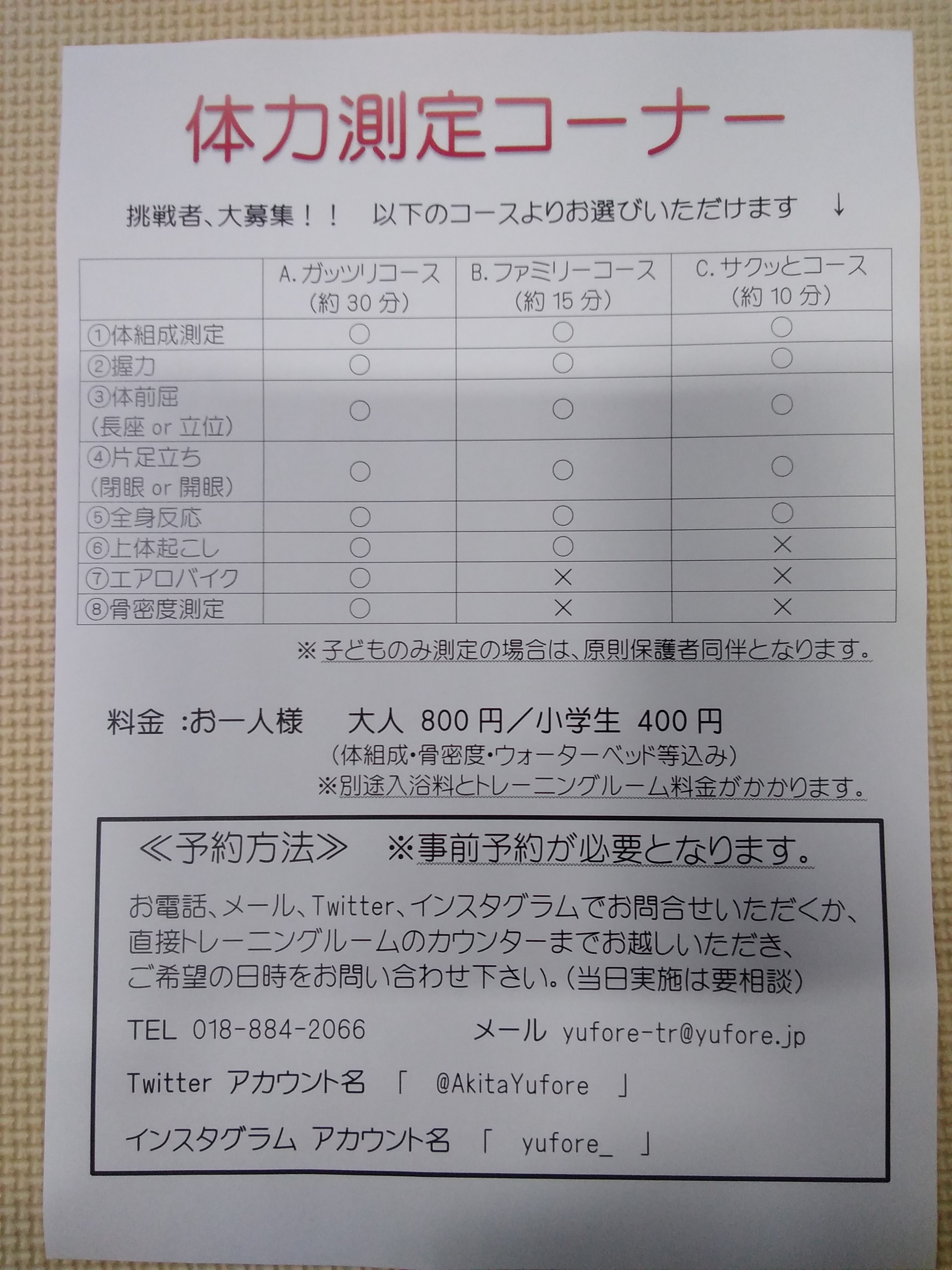 ユフォーレのトレーニングルームでは、体力測定を実施しております!