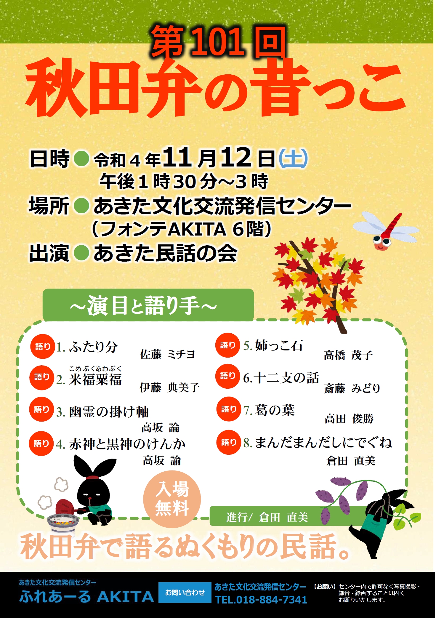 秋田県南地域に語り継がれる民話を披露します。秋田弁で語られる、あたたかな民話の世界をお楽しみください。主な演目は「赤神と黒神のけんか」「葛の葉」「まんだまんだしにでぐね」ほか。