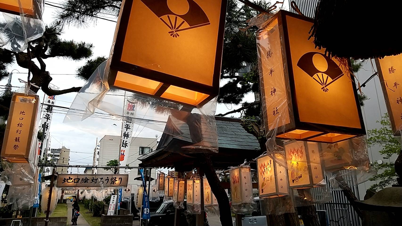 地元住民や子供たちが風刺をきかせた絵やメッセージをかき込んだ地口絵灯籠が神社境内や周辺に飾られます。