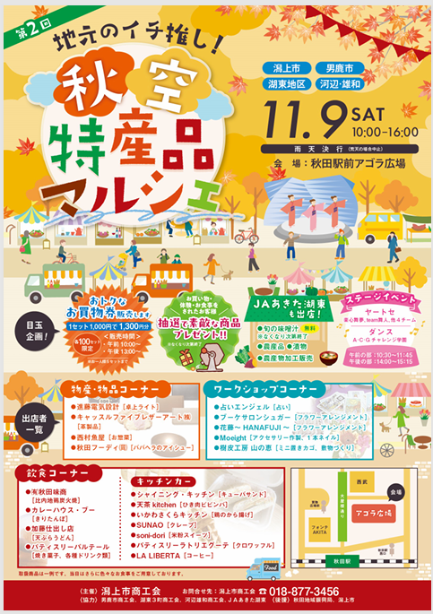 「潟上・男鹿・湖東3町・河辺雄和 4商工会合同イベント『第2回 地元のイチ推し!秋空特産品マルシェ』」を開催します。販売の他体験コーナーやステージイベントなど盛りだくさんです。