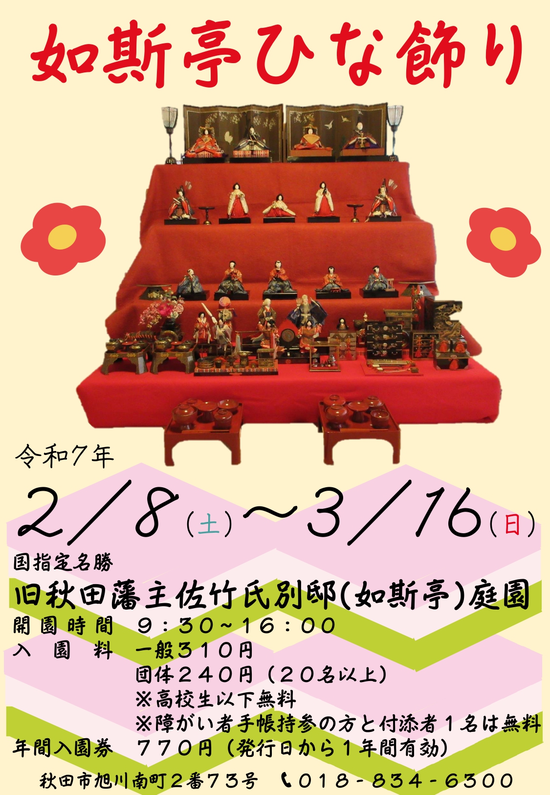 旧秋田藩主佐竹氏別邸(如斯亭 / じょしてい)庭園で、ひな人形の展示が行われています。