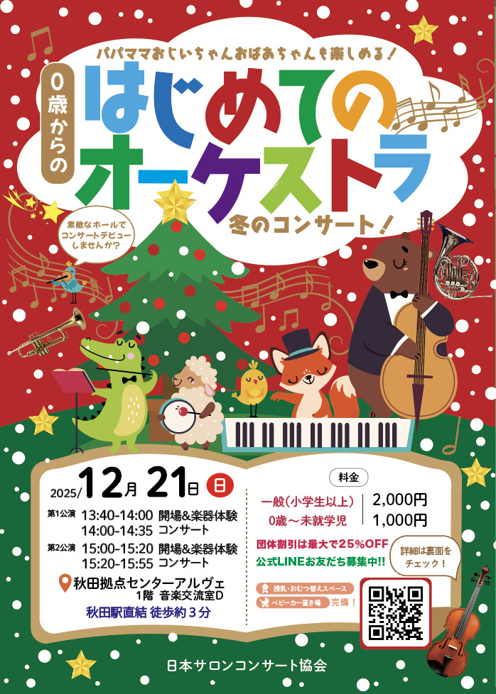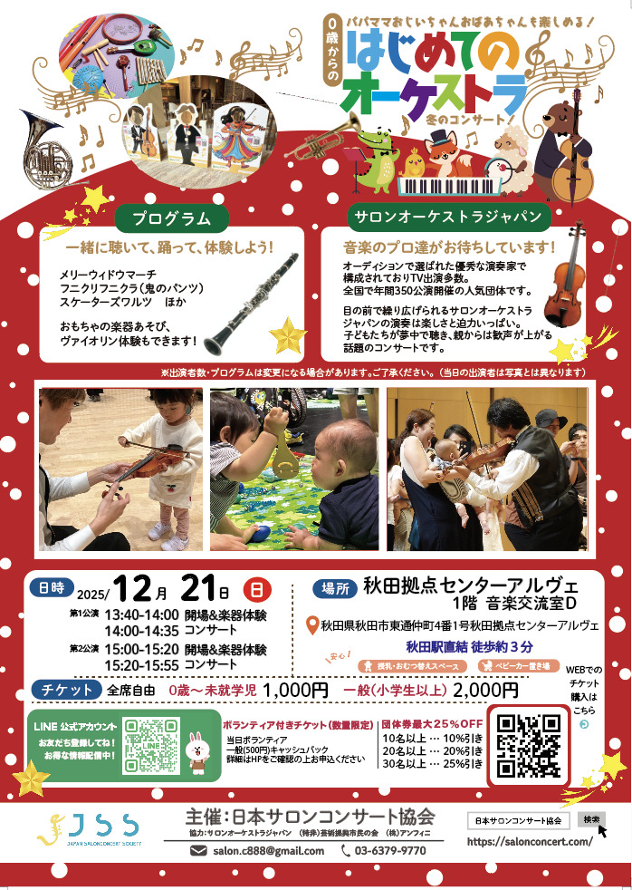 開演前には音のでるおもちゃの楽器や、本物のヴァイオリンに触れられる楽器体験コーナーも!コンサートでは楽器のすぐ近くで聴いたり、手拍子で共演したり、ママと一緒に踊ったり..初めての音楽との出会いに最適なコンサートです。【冬プログラム】ワルツで踊ろう!のコーナーはスケーターズワルツ、鬼のパンツ(フニクリフニクラ)、メリーウィドウマーチ、ほか。クリスマス気分を盛り上げる名曲を次々演奏!