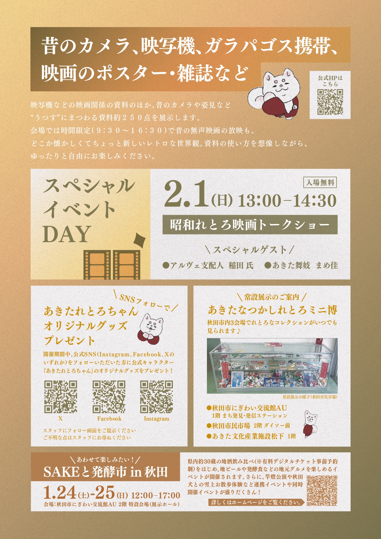 テーマごとの”れとろ”なコレクションを秋田市中心市街地各所に展示する「あきたなつかしれとろ博覧会」。第3回のテーマは「うつす」。昔のカメラ、映写機、映画のポスター・雑誌など、”うつす”にまつわる資料などを数多く展示します。また、会場では時間限定で昔の無声映画の放映やスペシャルイベントとして『昭和れとろ映画トークショー』も予定しています。