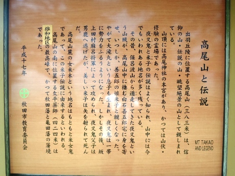 鬼退治の民話や鬼が相撲を取ったという場所が残る。キャンプ場や山荘、散策路があり標高383mの山頂からは田園風景と雄物川の流れが一望できる。
