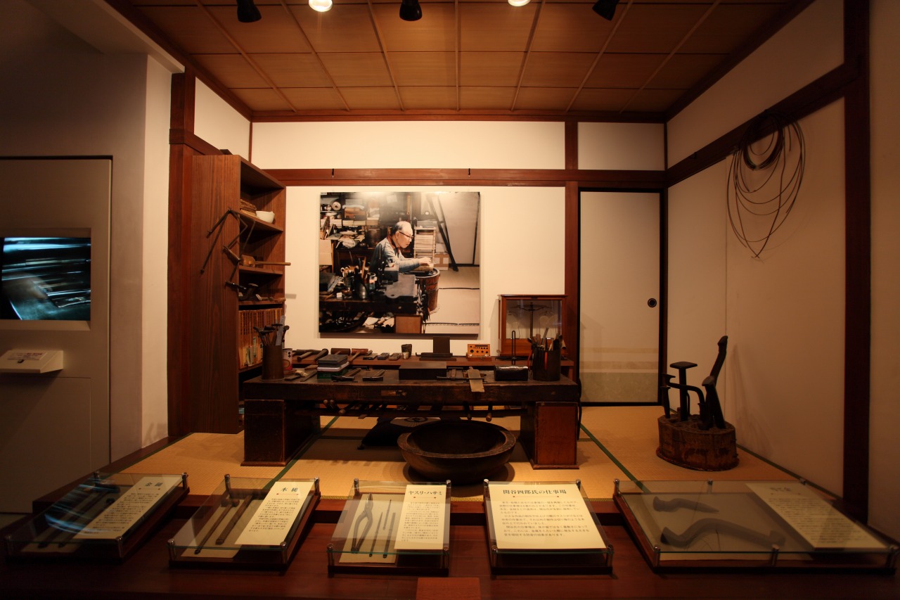 自宅アトリエを再現し、本人が使用した道具類も展示している。