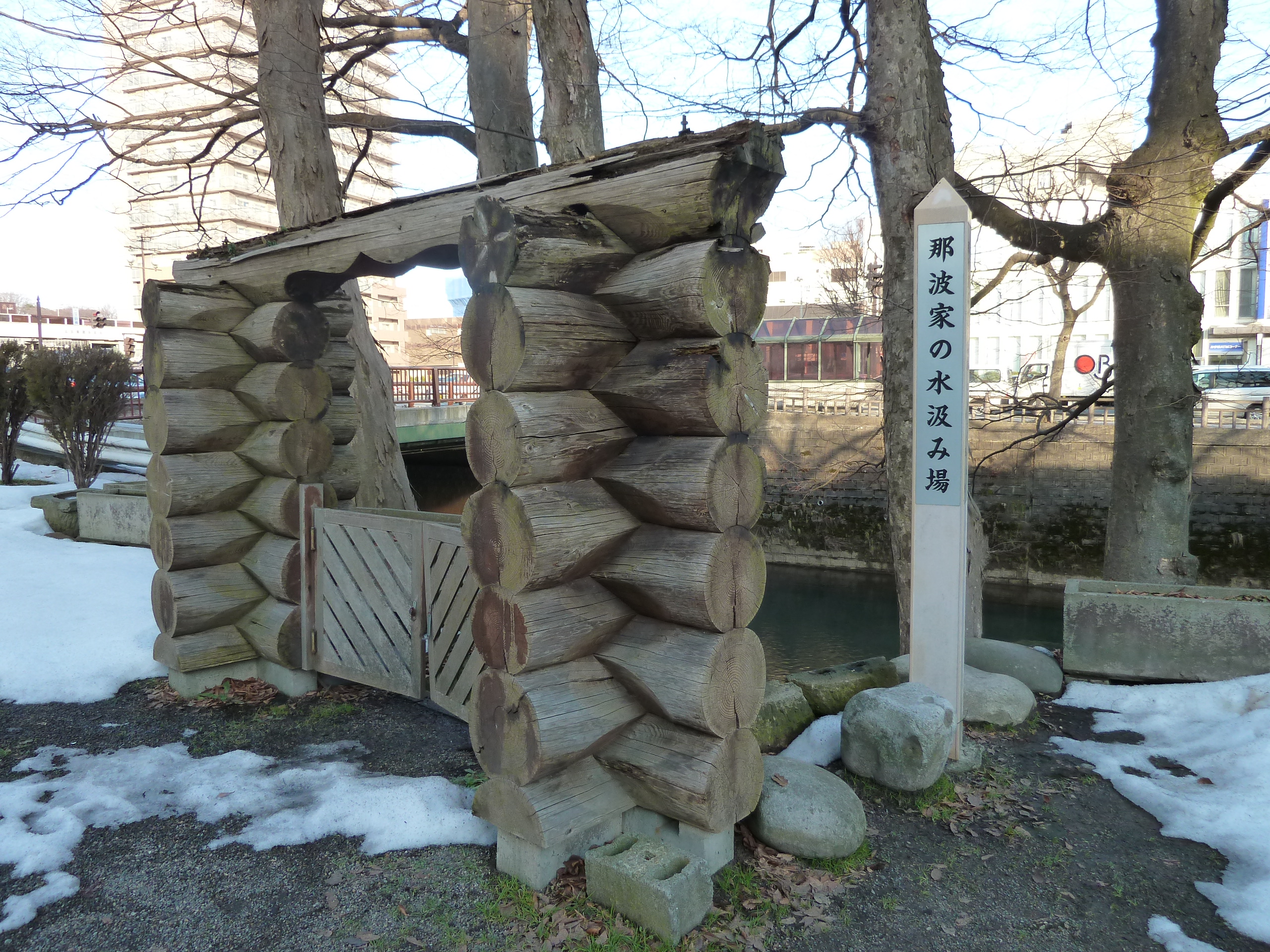 川反の各町には「カド」と称する共用の水汲み場があったが、現在残っているのはこの水汲み場だけである。 川反の川岸で物資の積み下ろしが行われ、那波家の水汲み場も利用されていたと思われる。 久保田城下の名残りが感じられる癒しのスポット。