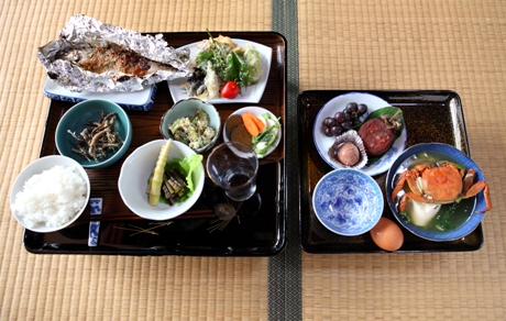 山菜、地元の野菜をもとに川で獲れたカニ、魚、ドジョウ、カマドで炊いたご飯を食べさせてもらえます。
