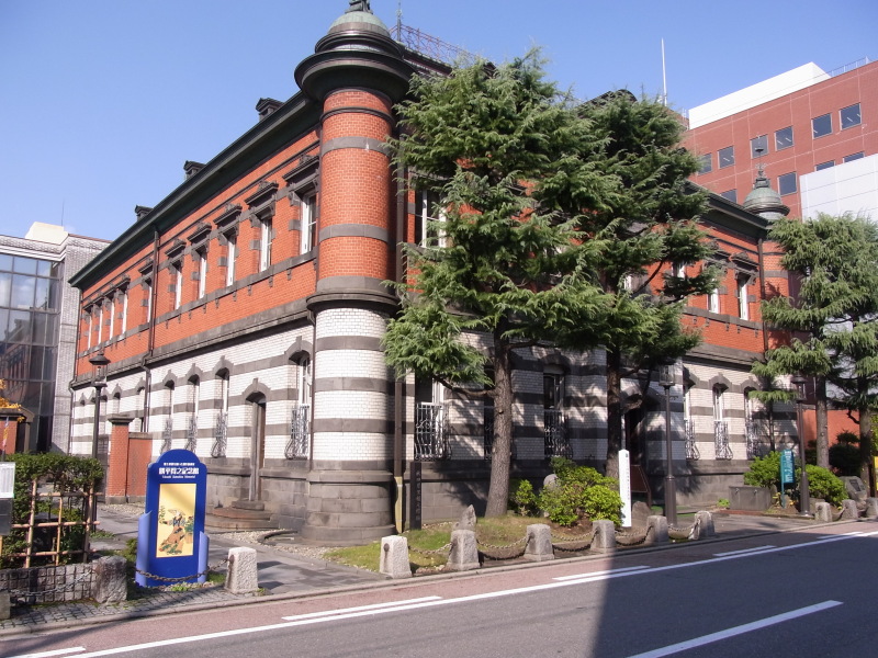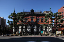 赤と白のコントラストが美しいこの建物は、ルネサンス様式を基調とした外観が特徴です。外壁の土台は男鹿石の切り石積み、1階が白の磁器タイル張り、2階は赤レンガを小口出しに積み上げて造られています。