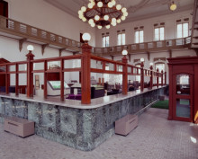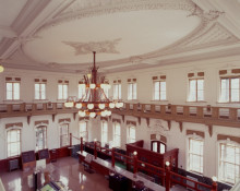 2階までの吹き抜けになっていて、忍冬唐草(にんどうからくさ)模様のレリーフ(浮き彫り)が美しい天井には、豪華なシャンデリアがつるされています。