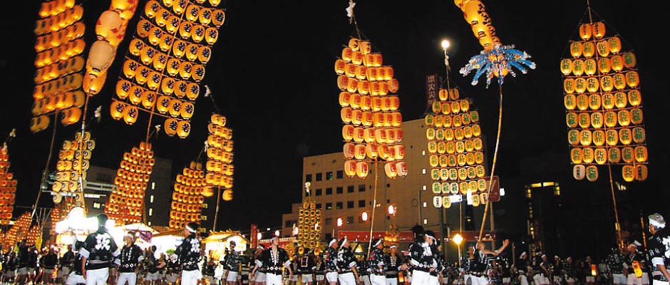 提灯を揺らめかせ、稲穂に見立てた竿燈を操りながら力と技を競う竿燈まつり。国重要無形民俗文化財に指定され、東北三大まつりのひとつにも数えられている夏の風物詩です。