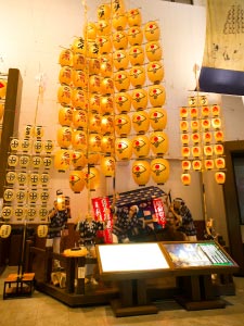 なかでも見事なのが竿燈です。大きな竿燈を実際に間近で見られるほか、日によって秋田市竿燈会のメンバーによる実演が繰り広げられます。そのほか各町内の竿燈に吊り下げる提灯がずらりと並んでいて、描かれている町紋を見ることができます。これには帆船や馬、豊作への願いなど、暮らしに関わる絵柄が用いられており、竿燈と暮らしとの結びつきが感じられるでしょう。