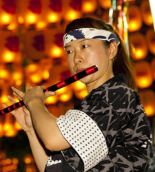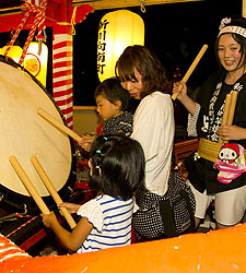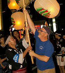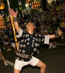 竿燈は大きさで分けて4種類あり、大きなほうから大若、中若、小若、幼若があります。大若は長さ12m、重さ50kg、竿に46個の提灯が吊るされます。これを力4分、技6分といわれる絶妙なバランスで、手のひら、額、肩、腰などに移しかえて技を競います。大若の団体戦、個人戦のほか、囃子方の演奏もまた見どころのひとつ。太鼓と笛の竿燈囃子の競演もお見逃しなく。