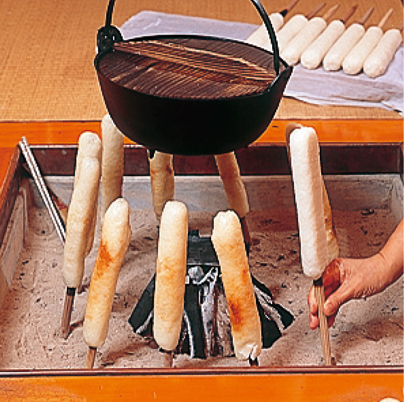 新米を炊いて粗くつぶし、秋田杉の串にまいて焼いたものがきりたんぽ。野菜やきのこと比内地鶏を煮込み、きりたんぽを入れて味わう鍋は収穫の喜びを分かち合う秋の味覚。きりたんぽに味噌を塗って焼けば味噌たんぽの出来上がり。