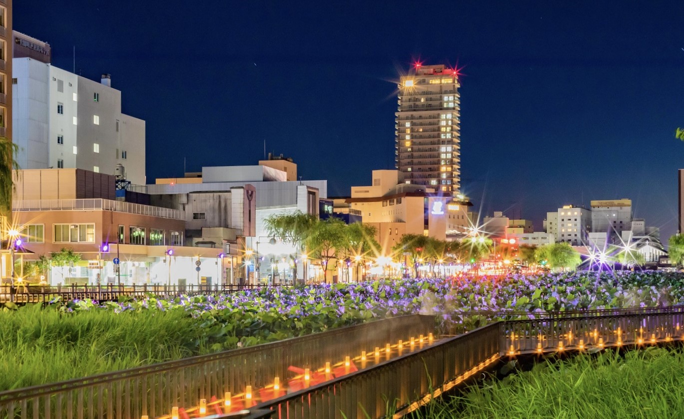 在此可欣賞到繞著千秋公園的護城河綻放的美麗蓮花之外,透過夜晚的點燈更能體驗與晨間截然不同的美妙氛圍。且期間中另有舉辦各式各樣的活動。